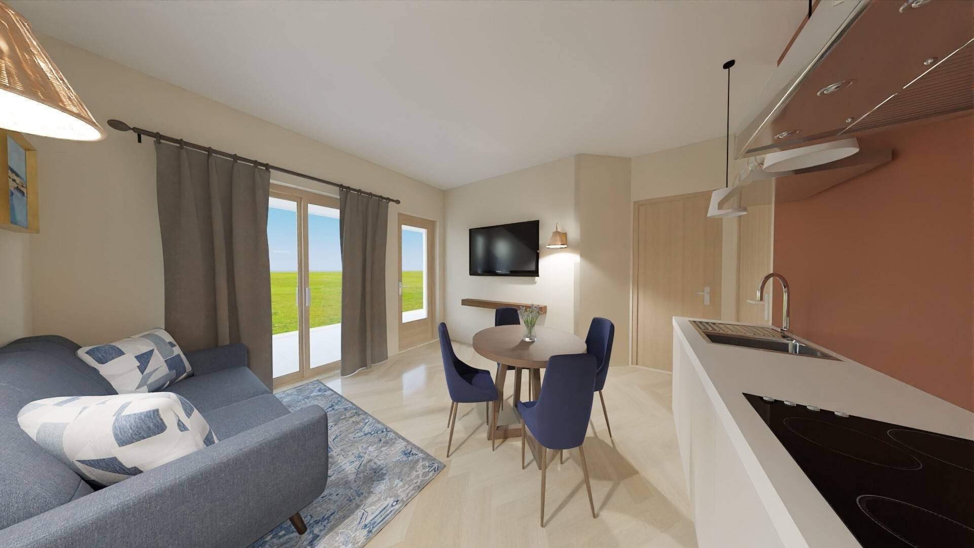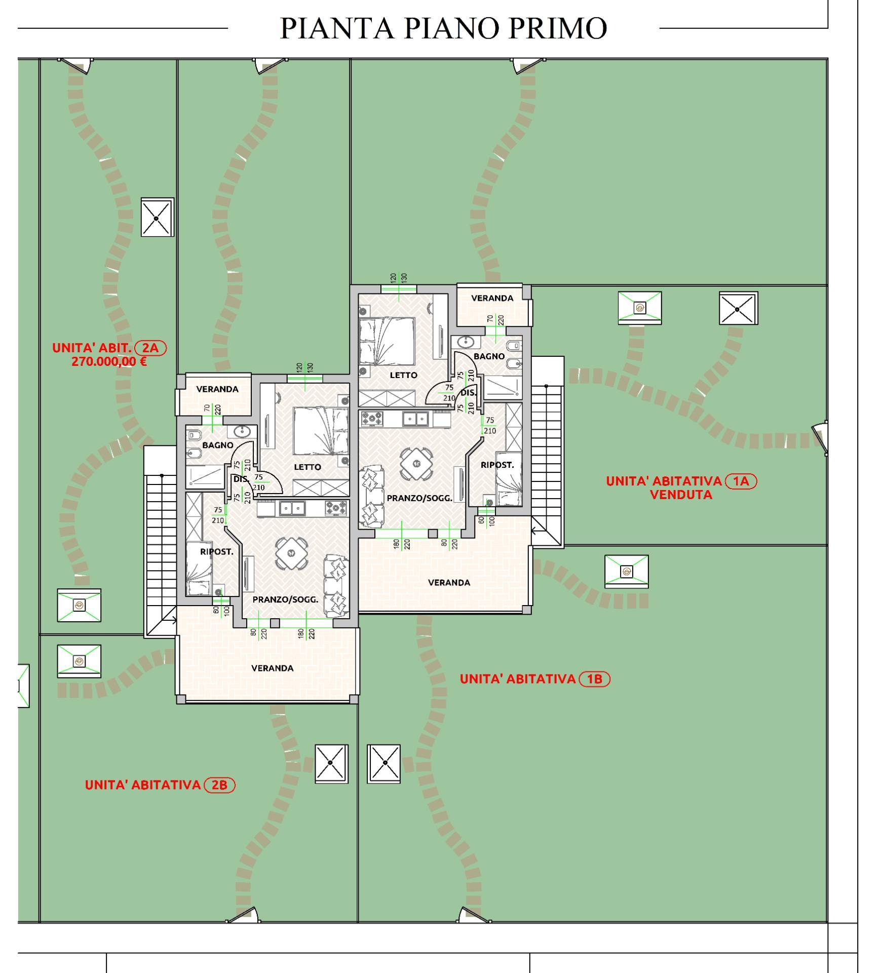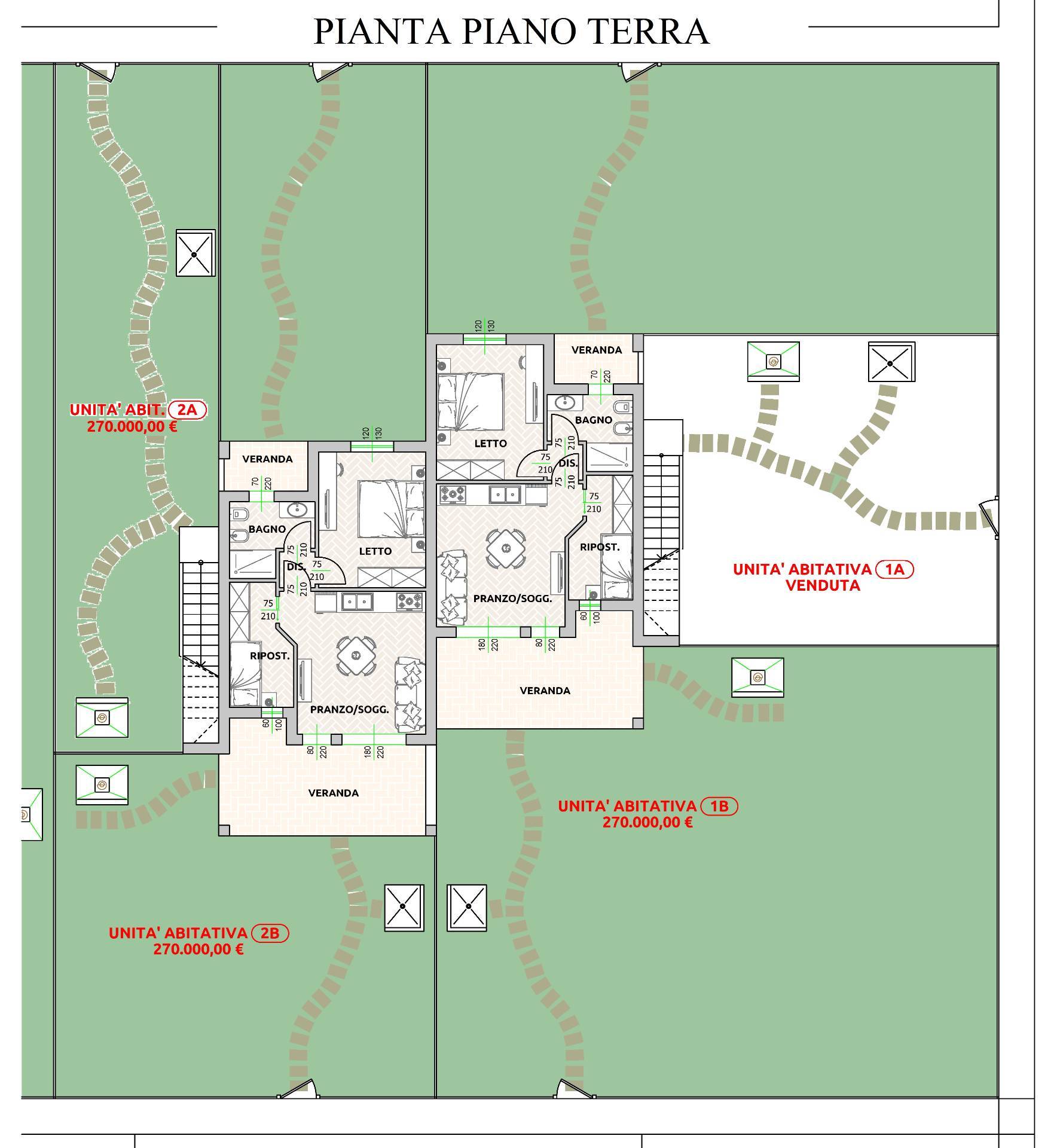 Ogni appartamento è composto da un'ampia veranda di ingresso, pranzo soggiorno, un ripostiglio, una camera da letto e un bagno finestrato con doccia.