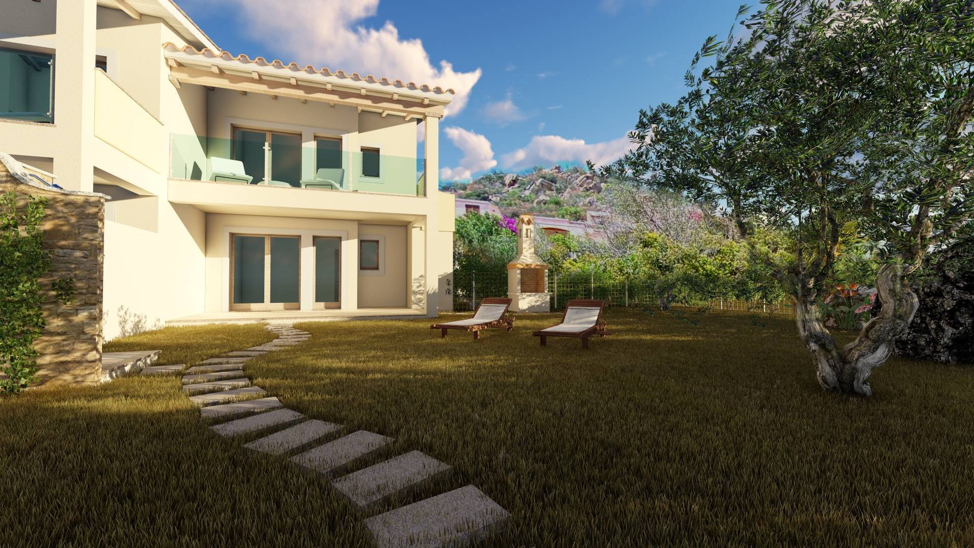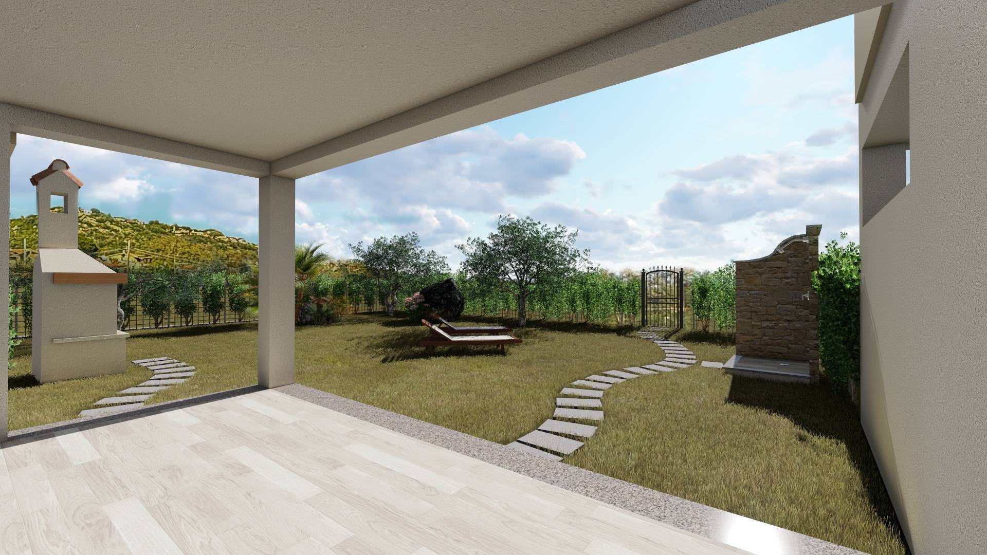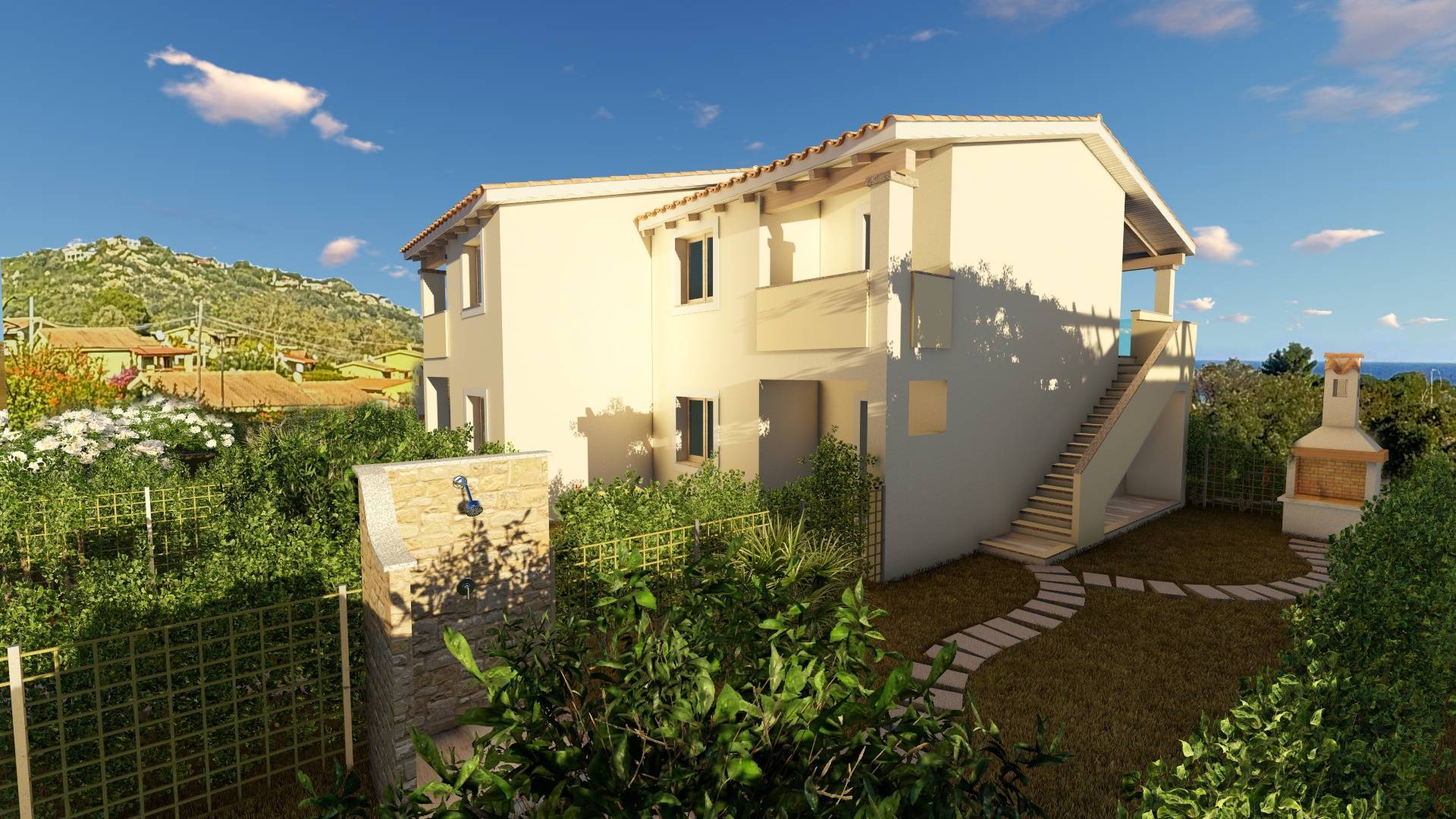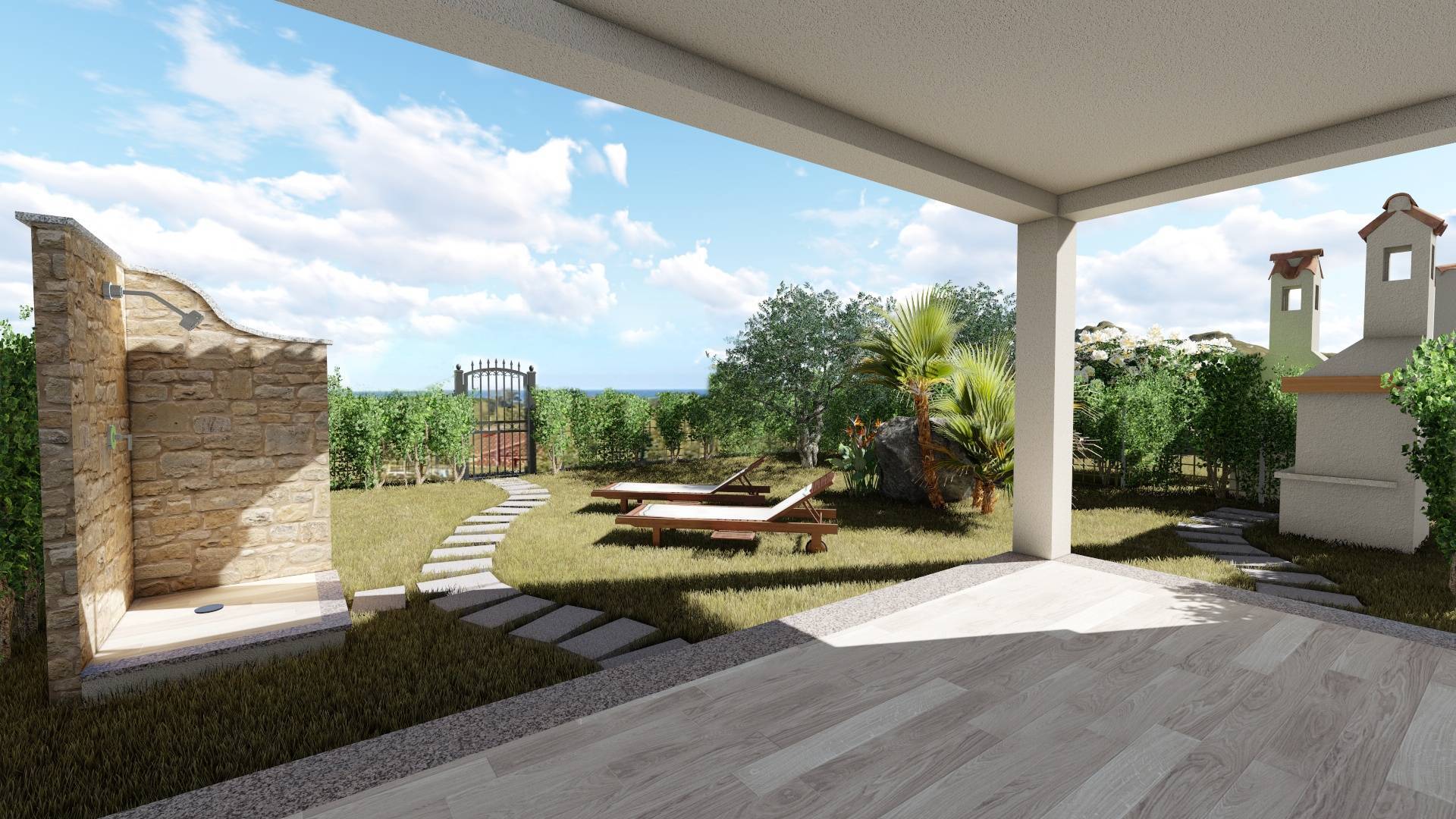 All'interno del giardino è prevista la realizzazione di una doccia esterna e un barbecue.
