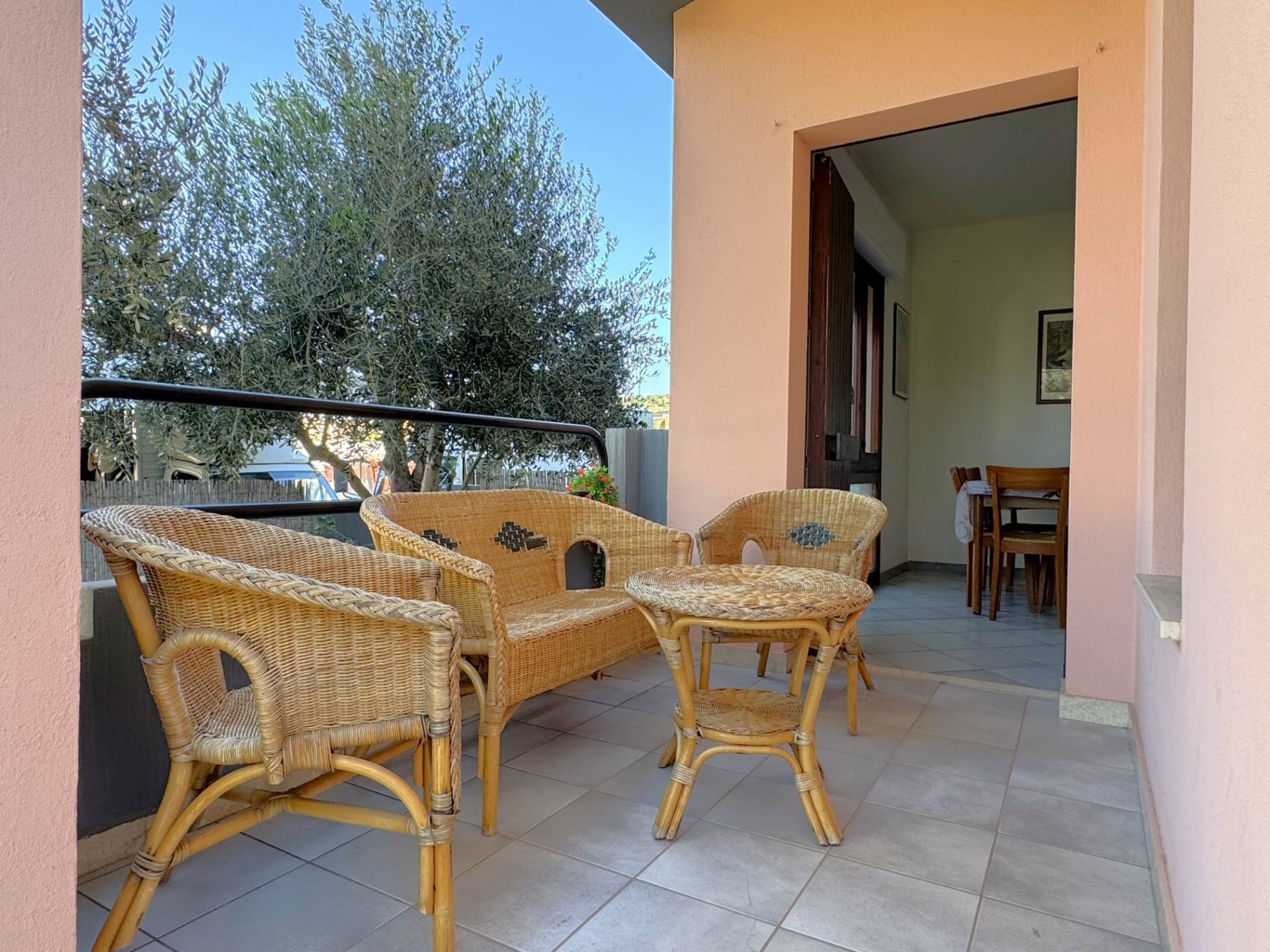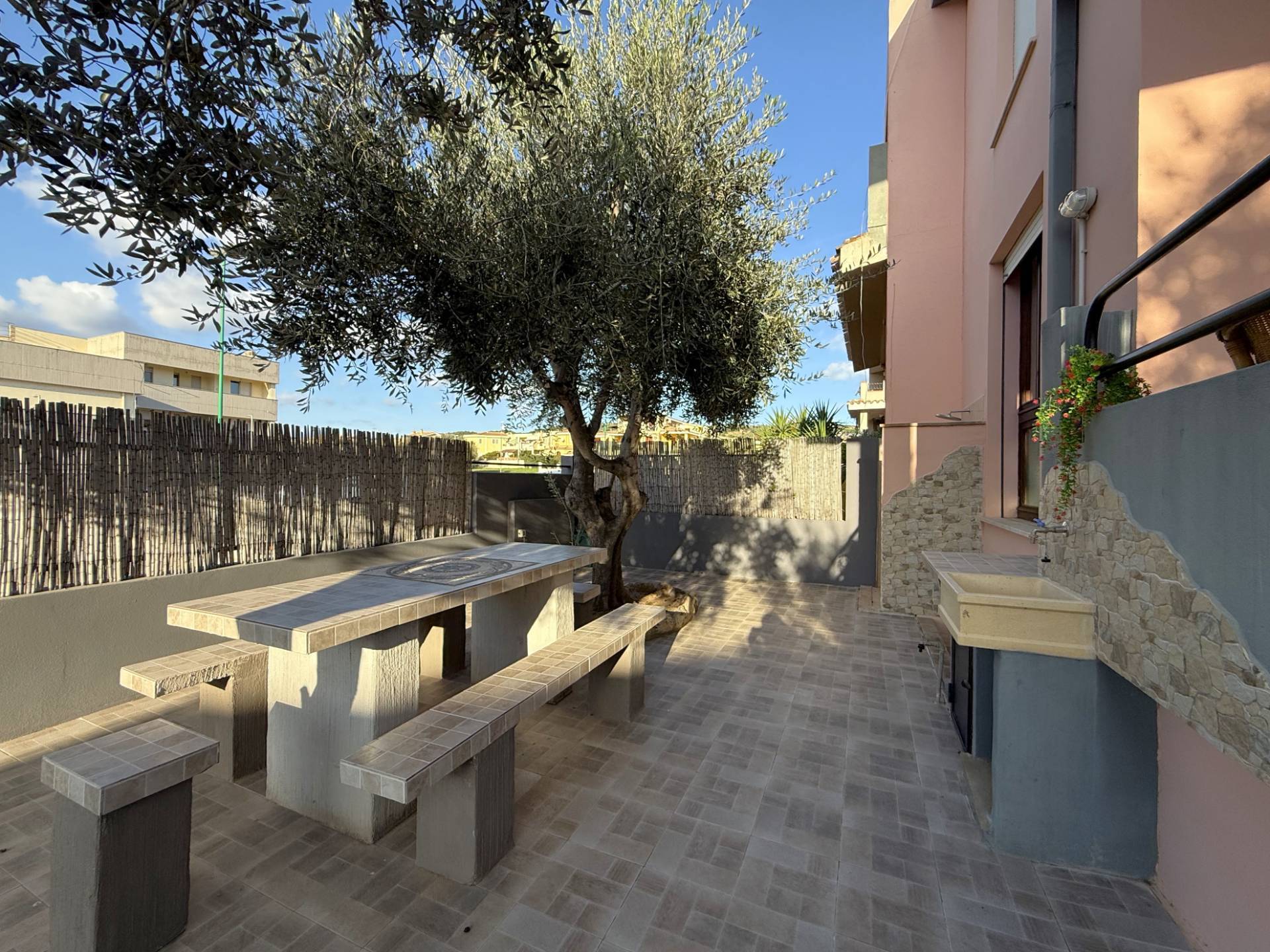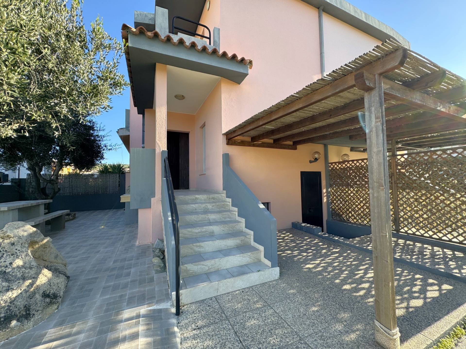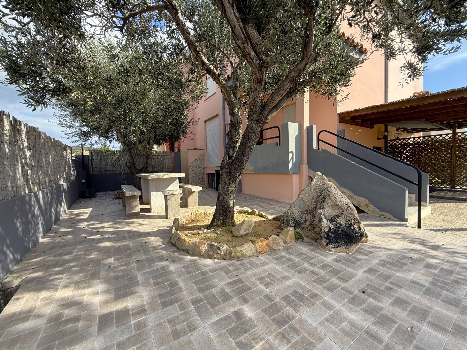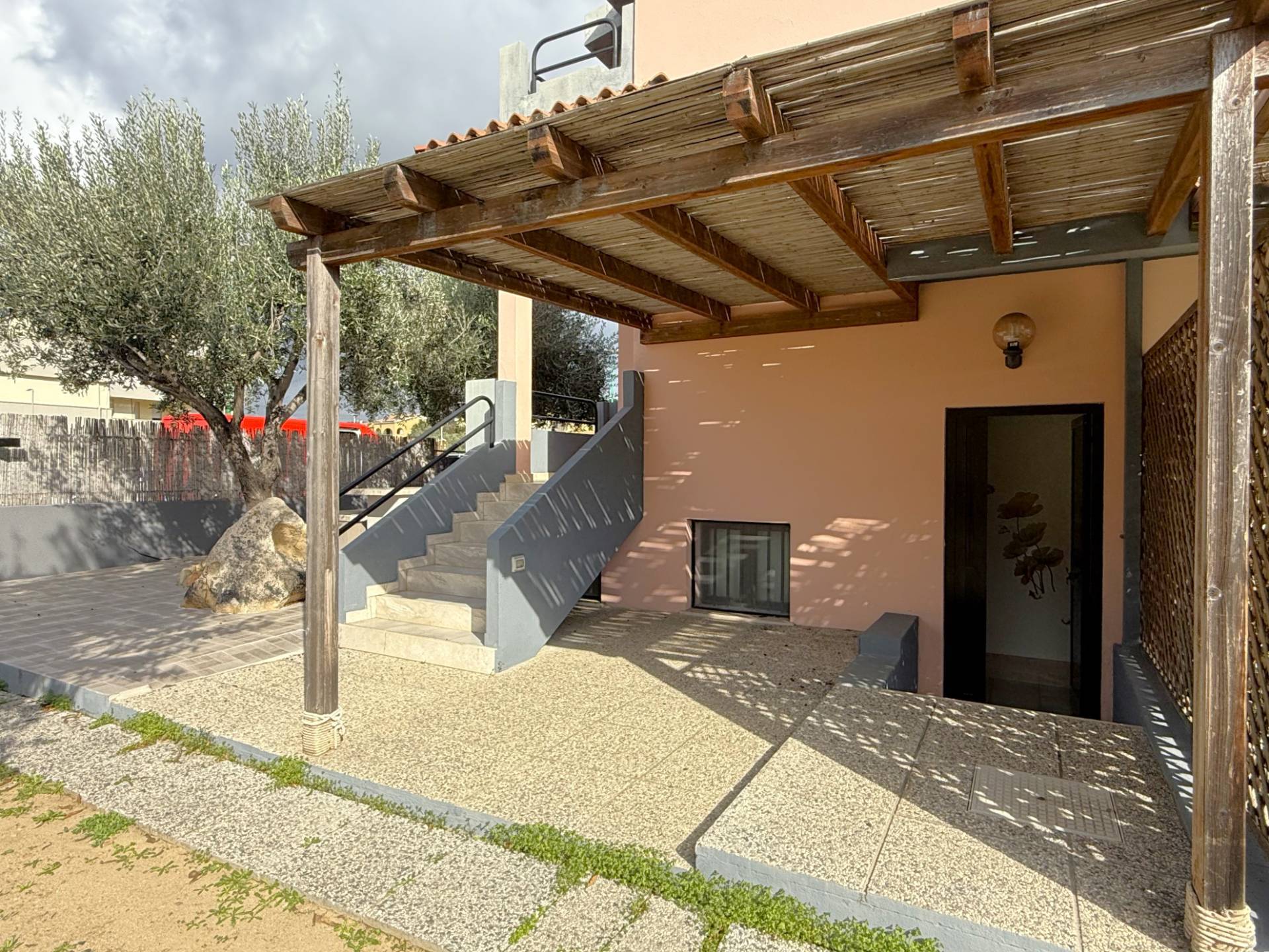 L'accesso è garantito dal cancello carrabile, seguito dal cortile lastricato privato, adornato con tavolo e panche in muratura, piante di ulivo, lavabo e doccia esterna.