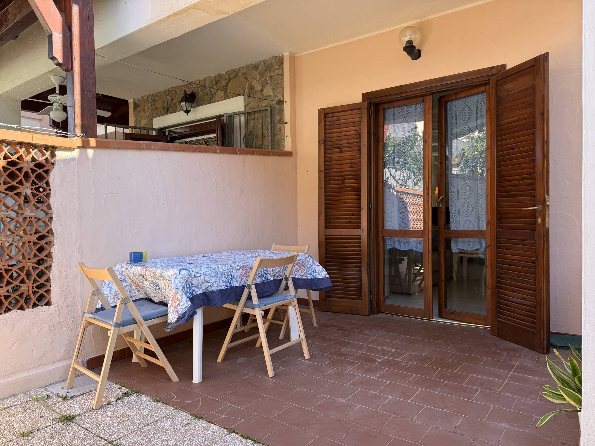 Accogliente giardinetto di ingresso con comoda veranda coperta, ideale per organizzare piacevoli cene all'aperto o per trascorrere momenti di relax in totale privacy.